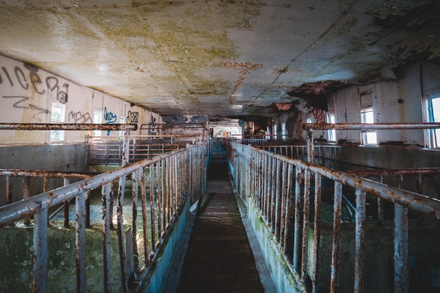 生豬屠宰前在待宰間休息,以使畜體代謝恢復正常,排出積蓄在體內(nèi)的代謝產(chǎn)物;屠宰前對待宰的活豬進行噴水淋浴以消除豬體表的污物,減少在加工過程中的污染。清洗完畢后首先將豬致暈,致暈過程可減少豬的應激反應,控制pH,提高產(chǎn)品質(zhì)量。致暈的生豬刺殺后立即用鐵鏈子將豬腿拴住,盡快放血。